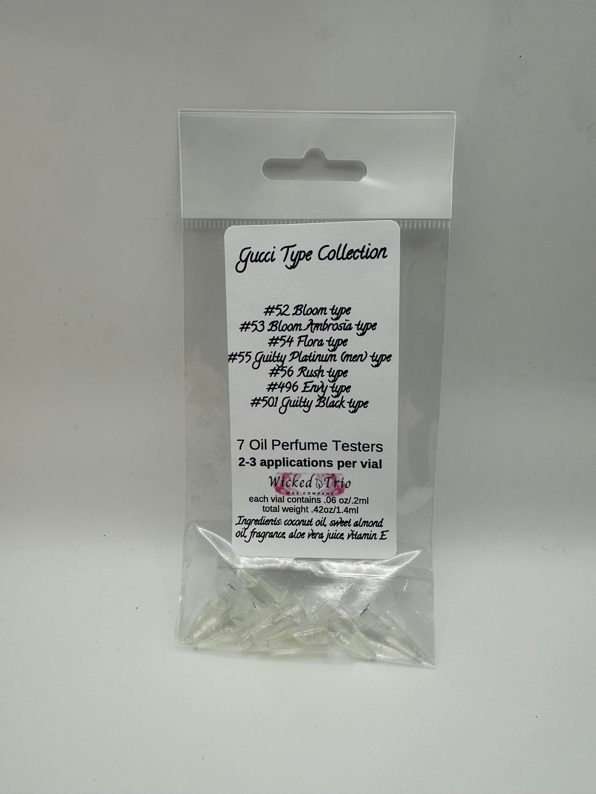 Our collections include all of the scents that we own from that brand. We made these so you can sample our scents and see what you like without spending money on full size products.