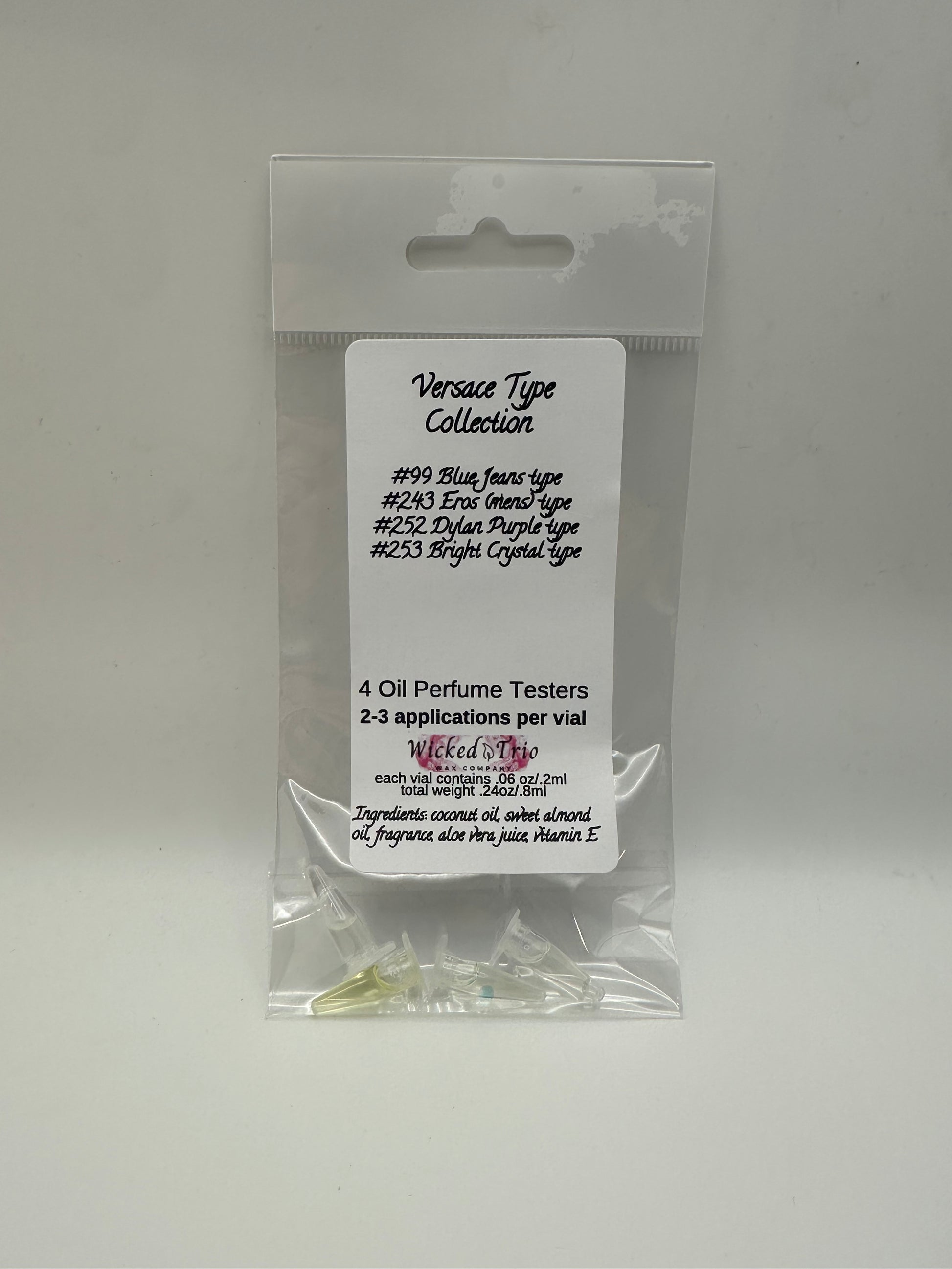 Our collections include all of the scents that we own from that brand. We made these so you can sample our scents and see what you like without spending money on full size products.